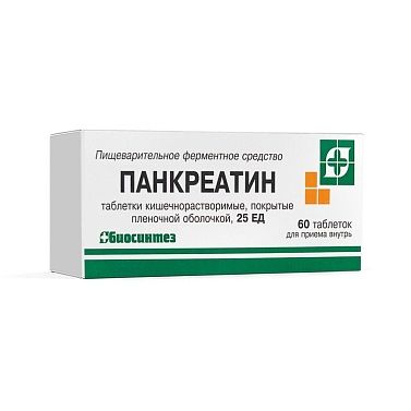 Панкреатин таблетки,кишечнорастворимые покрытые пленочной оболочкой 25ед (10х6) к/яч. N60