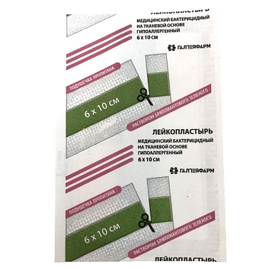 Лейкопластырь мед.бакт.гипоаллерг. на ткан.осн.6х10см (с р-ром брил.зеленого) ГАЛТЕЯФАРМ №1