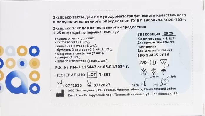 Экспресс-тест ВИЧ 1/2 (в крови/сыворотке/плазме) комплект №1