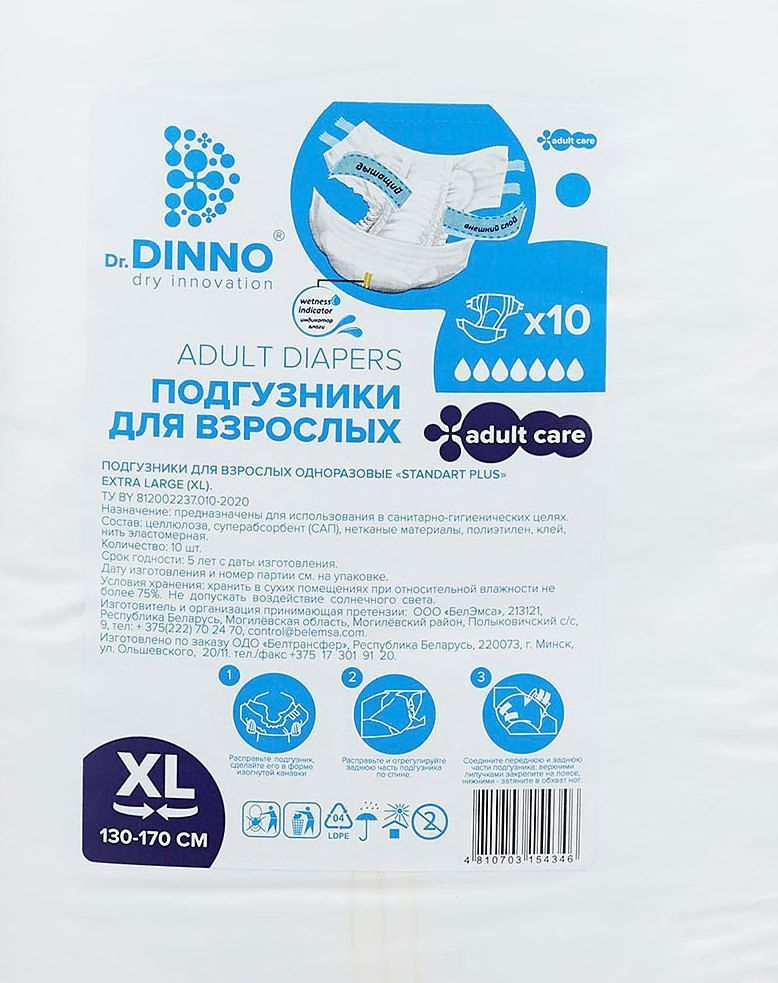 Подгузники впитывающие для взрослых Dr.DINNO Standart Plus XL (130-170см) №10